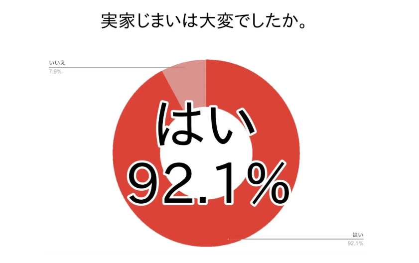 実家じまいでは、「自分たちで何とかしよう」と無理をすると、時間も体力も想像以上に消耗しがちです。株式会社アンビシャスのアンケートでも、実家じまいで大変だったと感じた人は92%にのぼっています。