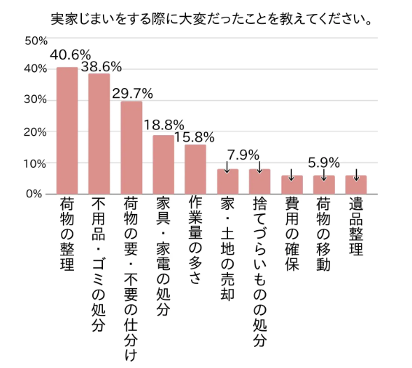 株式会社アンビシャスのアンケートでも、実家じまいで大変だったこととして荷物の整理や処分が多く挙げられています。思い出の品が多いほど手が止まりやすく、体力的にも精神的にも負担が大きくなりがちです。
